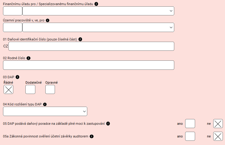 V hlavičce daňového formuláře nezapomeňte vyplnit své DIČ a označit, zda se jedná o řádné, opravné nebo dodatečné daňové přiznání. Dále zde uvedete místně příslušný finanční úřad a jeho územní pracoviště, kterým přiznání podáváte.