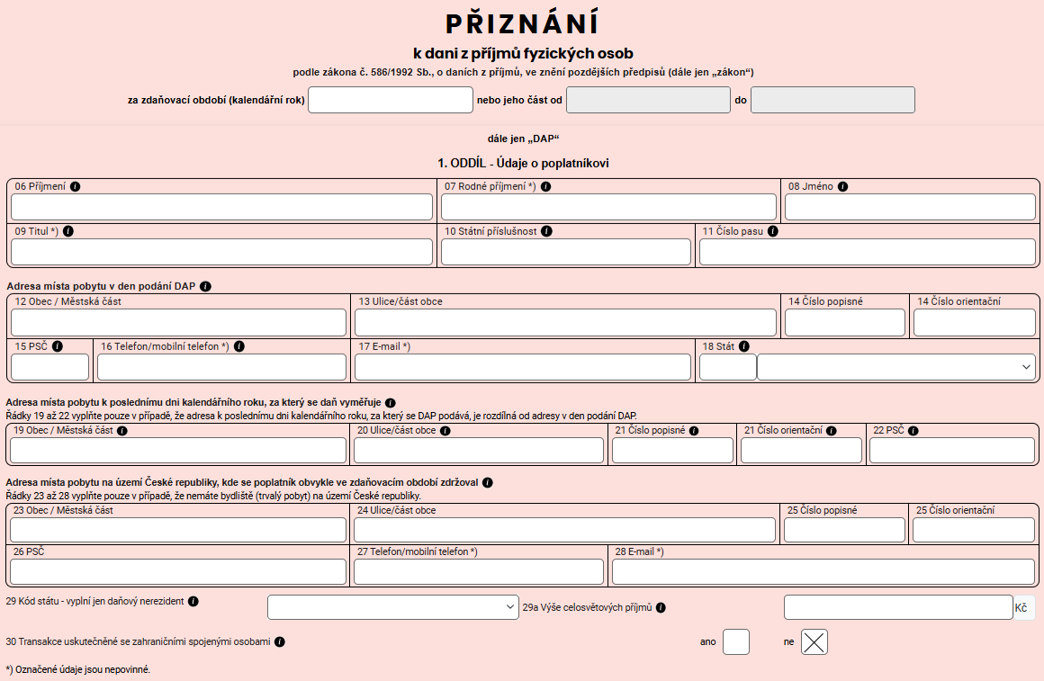Základní formulář vyplňují všichni poplatníci. Obsahuje Vaše identifikační údaje a hlavní informace o Vašem základu daně, slevách na dani a celkové výši daně.