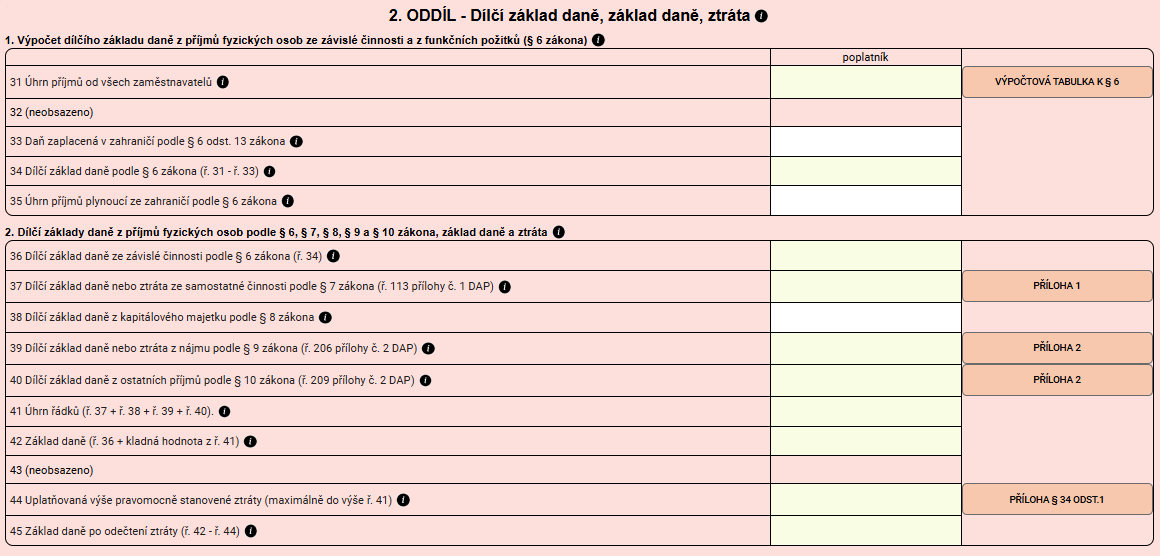 Další sekce je o něco komplikovanější. Uvádíte v ní totiž dílčí základy daně ze všech svých příjmů (přečtěte si, které příjmy patří do daňového přiznání). To v praxi znamená, že se vyplňuje až poté, co vypíšete všechny přílohy k daňovému přiznání (viz dále). Právě v nich totiž dílčí základy daně vypočtete.