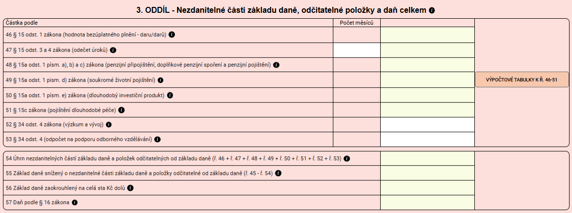 Základ daně se následně ve 3. oddíle snižuje o nezdanitelné části základu daně (např. dary nebo příspěvky na doplňkové penzijní spoření) a odčitatelné položky.