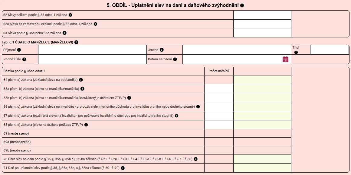 Od ní následně v 5. oddíle odečtete uplatňované slevy (např. sleva na poplatníka nebo invaliditu) a daňové zvýhodnění na děti.