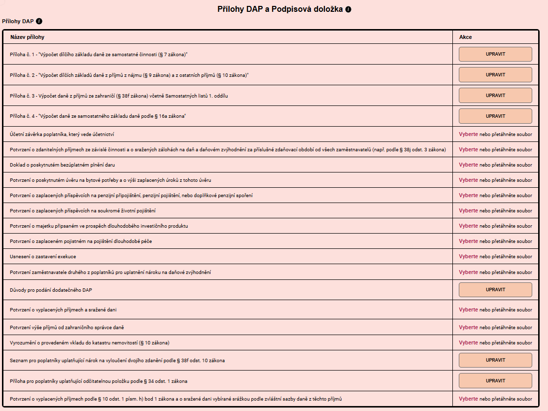 Součástí DAP bývají také vybrané přílohy. Které přílohy vyplňujete, záleží především na druhu Vašich příjmů.
